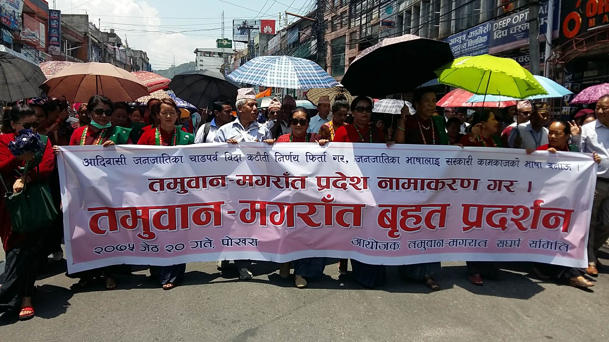 कास्कीका आदिवासी जनजातिहरुले तमुवान—मगरात प्रदेश नामाकरण गर्न माग गर्दै शनिवार पोखरामा बृहत जनप्रदर्शन गरेकाछन्। तमु धिं नेपालकी अध्यक्ष कर्म तमुको संयोजकत्वमा गठित तमुवान—मगराँत संघर्ष समितिद्धारा आयोजित तमुवान—मगराँत बृहत जनप्रदर्शनमा सामाजिक र साँस्कृतिक रमझममा रमाउने जनजातिहरु आफ्नो पहिचान र अधिकारका लागि सडकमा ओर्लेका हुन।